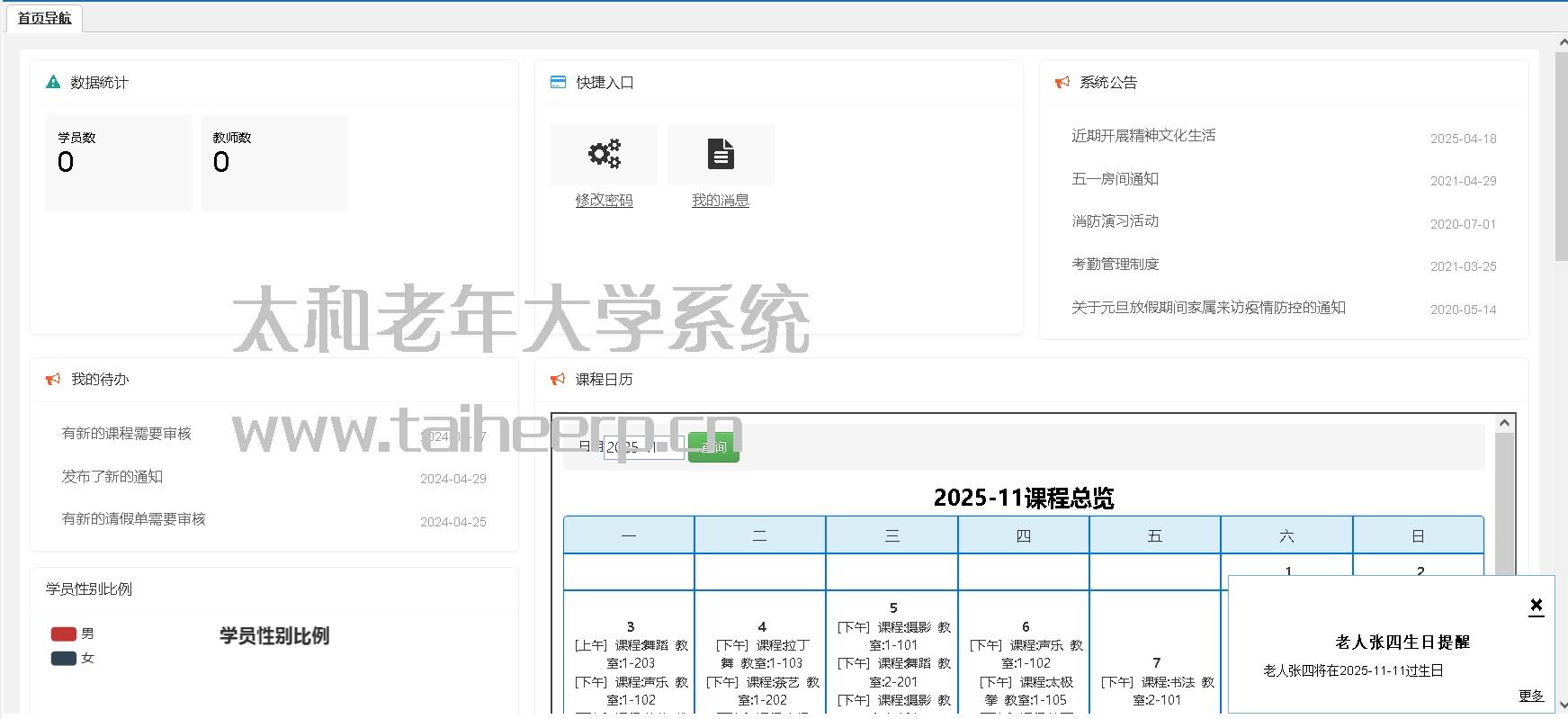 太和老年大学系统功能全面,包括全面的校务管理、教室管理、师资管理、课程管理和学员管理等功能,并通过人脸识别考勤系统,实现了对教师和学员的无感打卡工作,对接了学校的电子班排系统,并通过手机移动端实现学员和教师的课程表管理,请假和审批,考评和打分等管理 。