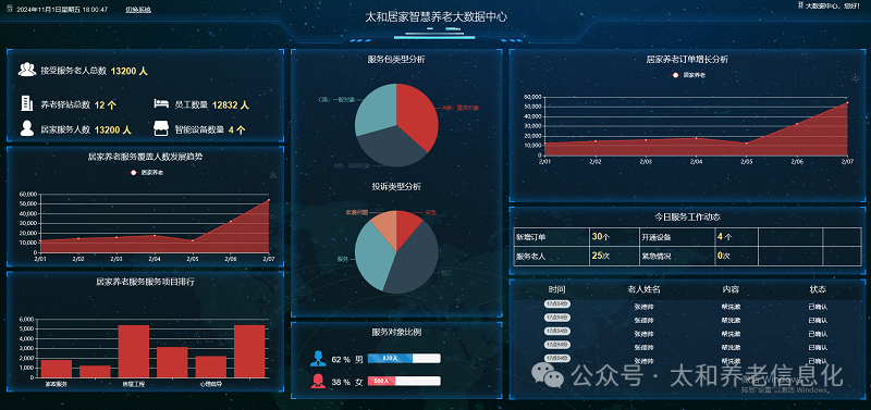太和养老针对江苏省在南通市的试点,携手合作伙伴南通家诚照护做为信息化示范基地,进行了落地应用试点,取得了非常好的效果!其中一键呼叫功能和智慧化大屏得到了来参观交流的众多长护险机构的认可和高度评价。